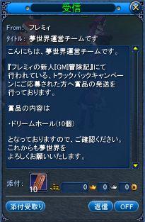 ~~三大神(3回目)~~ (llllll゚Д゚)絶望した!!!!! 深夜のイベ出た人は受けれないって・・・Orz 気を取り直し、三大神は過去一回しか参加したことのない旦那様の付き添いを。 17時間際に気づく、サブっこで参加すれば良かったと・・・。 誰かアタシを殴って!!!バカァぁぁあああ!! PLATINUMの混み具合を危惧して、20時からのイベまでINし続けようとしたのですが、リアル都合によりOUT。 再INはやばかったです。 15分間に及ぶログインゲームを経て、やっと入れました(´∀`;A そしたら・・・ 人形持ったままイベに参加してしまい・・・。 最近ボスがやたらと動き回るのでアワアワヽ(´Д`;≡;´Д`)ノしながら避難ww やっぱりちゃんと睡眠はとらないと頭が働かなくて駄目ですね。 ・・・誤爆も多くなるし・・・。