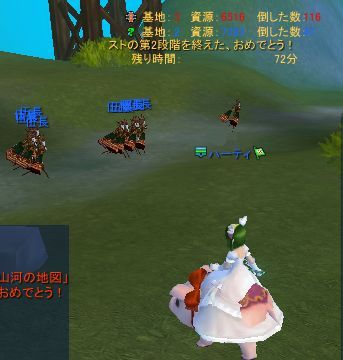 遂に開始時間にログイン間に合いませんでしたOrz 戦場にINできないどころかPC固まるしで・・・最悪です。 せめて10分・・・!10分猶予をください運営!! 今回でやっと伍長の姿をみることができました(≧∇≦) 結果 うーん一時期逆転してたんですが・・・残念。 惜しかったです>< 勝敗が付くと戦場から出るカウントダウンが始まり動けなくなるんですが・・・ ちょうどトレードを終えたばかりだったので、こんな空気椅子状態にwww トレードの度にいちいち騎乗解除されるの止めて欲しいなぁ。 自陣に90↑の方が単騎特攻してきましたが、囲まれてもHP全然減ってませんでした・・・((((;゚Д゚)))) 以前シスイベでたまたま隣にいたので装備を覗いたことがある方だったのですが、 さすがカンスト!っていう代物でしたw どうやったらあんな装備が手に入るんですかね。★3つとか。 HPの追加半端なかったです。鬼だアレww 今のとこ領土戦にルールはないみたいですが、 敵陣の復活地点には近づかないとか 敵陣の門の中へは入らないなど、 なにかルールが出来たら良いなぁと思うのです。 今日は復活地点を荒らされたりはしなかったみたいだけど、前回酷かったしねぇ・・・。 戦争には甘い考えかしら。。。 今日も懲りずにレクイエム~。